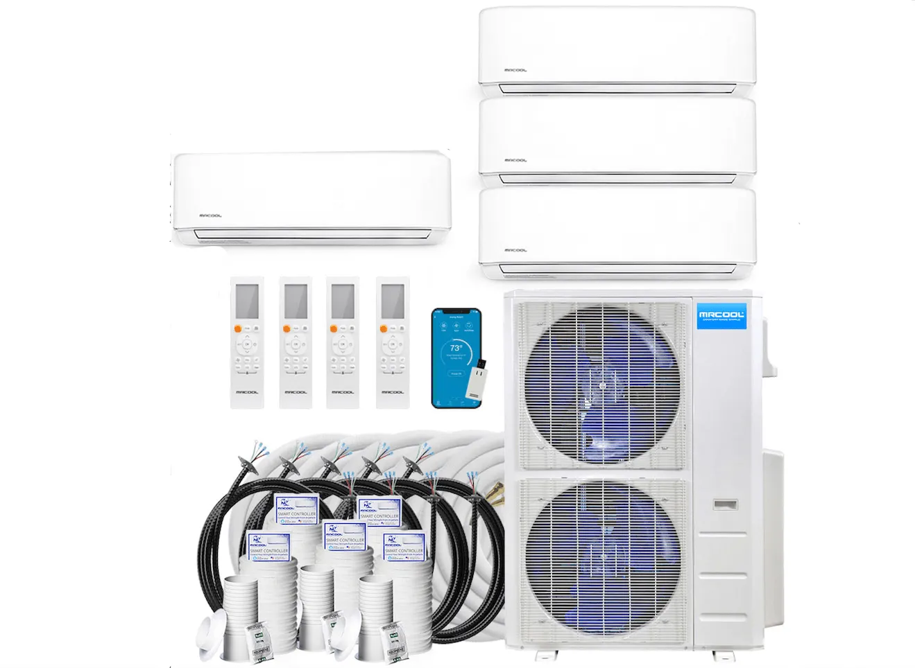 The MRCOOL DIY Multi-Zone 36,000 BTU 22 SEER 4 Zone Ductless Heat Pump Split System – 9K + 9K + 12K + 12K can cool through the Summer, heat through the Winter, and dehumidify through the wet seasons. Plus, you can quickly check the temperature of each room in your home from the easy-to-read digital display or the MRCOOL Smart Controller mobile app. The display on the front of each indoor air handler unit can also display troubleshooting codes and alerts, so you are always aware of any issues with your system. Operate each unit wirelessly with the included remote or the MRCOOL Smart Controller app for Apple or Android devices. You also have the ability to control your mini-split unit with Amazon Alexa or Google Home.